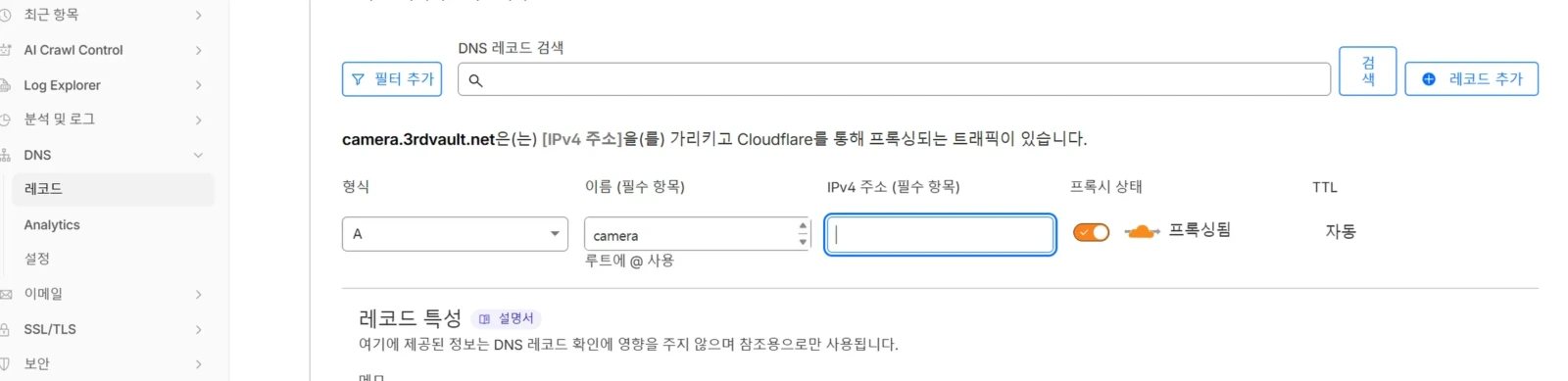 메인 도메인은 프록시를 유지하여 웹 보안을 챙기되, 카메라 전용 서브 도메인을 신설한다. 클라우드플레어의 DNS 메뉴에서 A 레코드 타입으로 해서 원하는 서브 도메인명을 입력하면 서브 도메인이 생성된다. 해당 레코드는 클라우드플레어 설정에서 ‘DNS 전용(DNS Only, 회색 구름)’으로 지정한다. 이를 통해 카메라는 클라우드플레어를 거치지 않고 시놀로지 서버와 직접 통신하게 되며, 서버가 보유한 실제 SSL 인증서를 온전히 수신할 수 있게 된다. 순서는 아래와 같다.