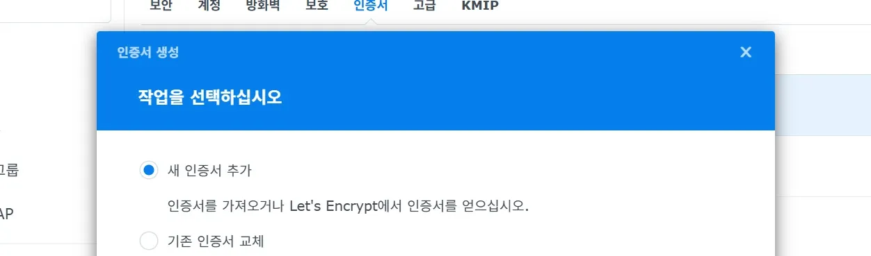 1. 인증서 발급: 시놀로지 제어판 > 보안 > 인증서 메뉴에서 추가를 클릭.